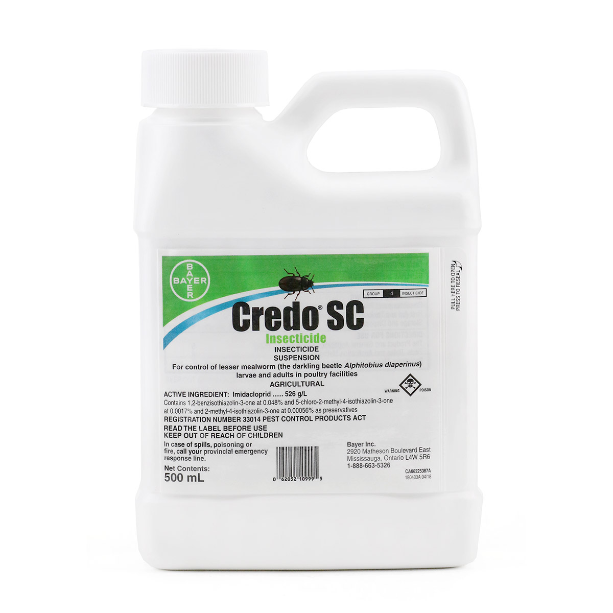 Credo is a premise spray for the control of darkling beetles (lesser mealworms) in poultry facilities. It can be applied as a broadcast, band, spot, or crack and crevice treatment. Active ingredient: imidacloprid (group 4 insecticide).